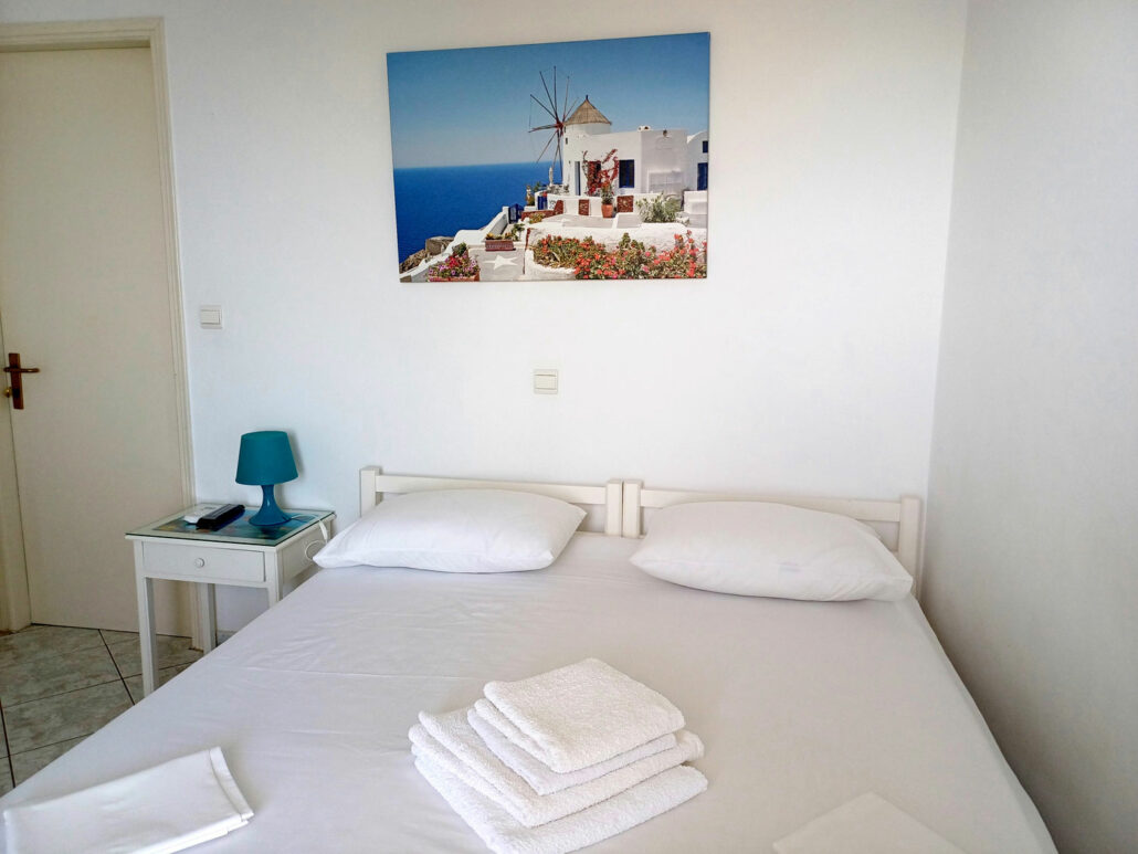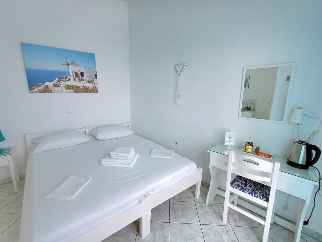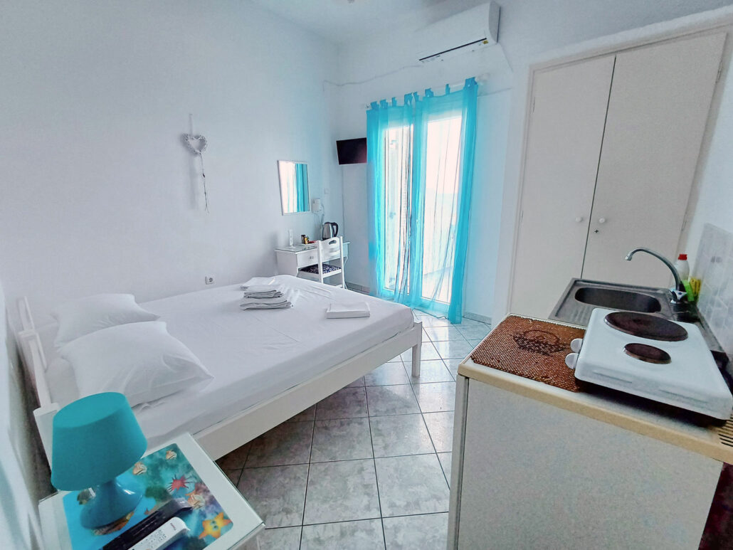 Άνετο δωμάτιο με δύο μονά κρεβάτια και μπαλκόνι με θέα στο Αιγαίο. Περιλαμβάνει κλιματισμό, δωρεάν Wi-Fi, τηλεόραση, ψυγείο, σεσουάρ, ιδιωτικό μπάνιο και εξοπλισμό μαγειρέματος — ιδανικό για ζευγάρια που απολαμβάνουν την ανεξαρτησία κατά τη διαμονή τους.